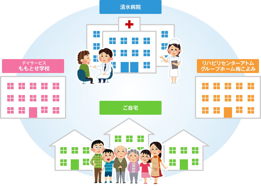 医療法人彩清会清水病院グループでは、医師はもとより、看護師、介護職、リハビリ職など多くの専門家が一体となって患者様や利用者様をサポートさせていただく体制を作っています。看護・理学療法・介護といったそれぞれのアプローチだけでは、十分なサービスはご提供できません。職種ごとの壁を取っ払い、それぞれの専門的な知見から最善の提案を連携しながら行っていく。医療・介護の現場を預からせていただくからこその責任を、グループのメンバー全員で果たしていきます。