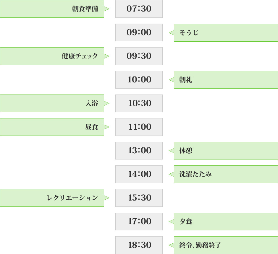 残業は月1~2時間程度。夜勤は月2~4回。週の勤務例は夜勤1回、日勤3回。残業なく日中時間を作れるので家事との両立がしやすく永くお勤めいただけます。