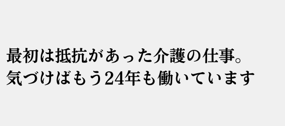 初めは介護という職種が「私に務まるのだろうか?」と不安に思いながら仕事をする日々でしたが、利用者さまと接していくうちに、介護をする楽しさや喜びを感じるようになりました。